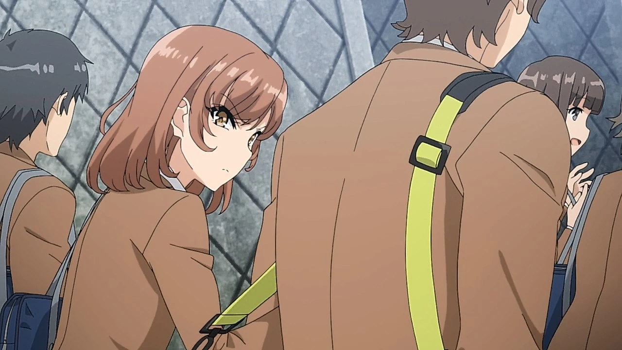 Sakuta, initially skeptical but intrigued, accompanies her around to test the phenomenon. Over the course of the episode he witnesses evidence that others truly do not perceive Mai. They go to the cafeteria and Mai sits across from him; the waitress only recognizes Sakuta and is surprised that he orders two things. The conversation reveals that Mai has noticed for some time that people are no longer noticing her, as if her existence is fading away.