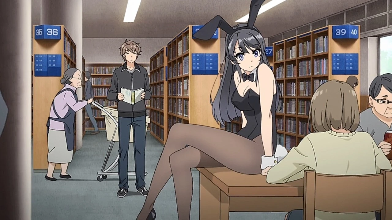 Eventually, Sakuta goes to the school library to relax; and unexpectedly spotting Mai Sakurajima wearing a bunny girl outfit as she wanders between the stacks. She is a famous actress who is currently on professional hiatus, and is also his senpai at school. At first he assumes it’s a joke or cosplay, but he soon notices something strange: no one else seems to notice her; fellow students pass by as if Mai were invisible.